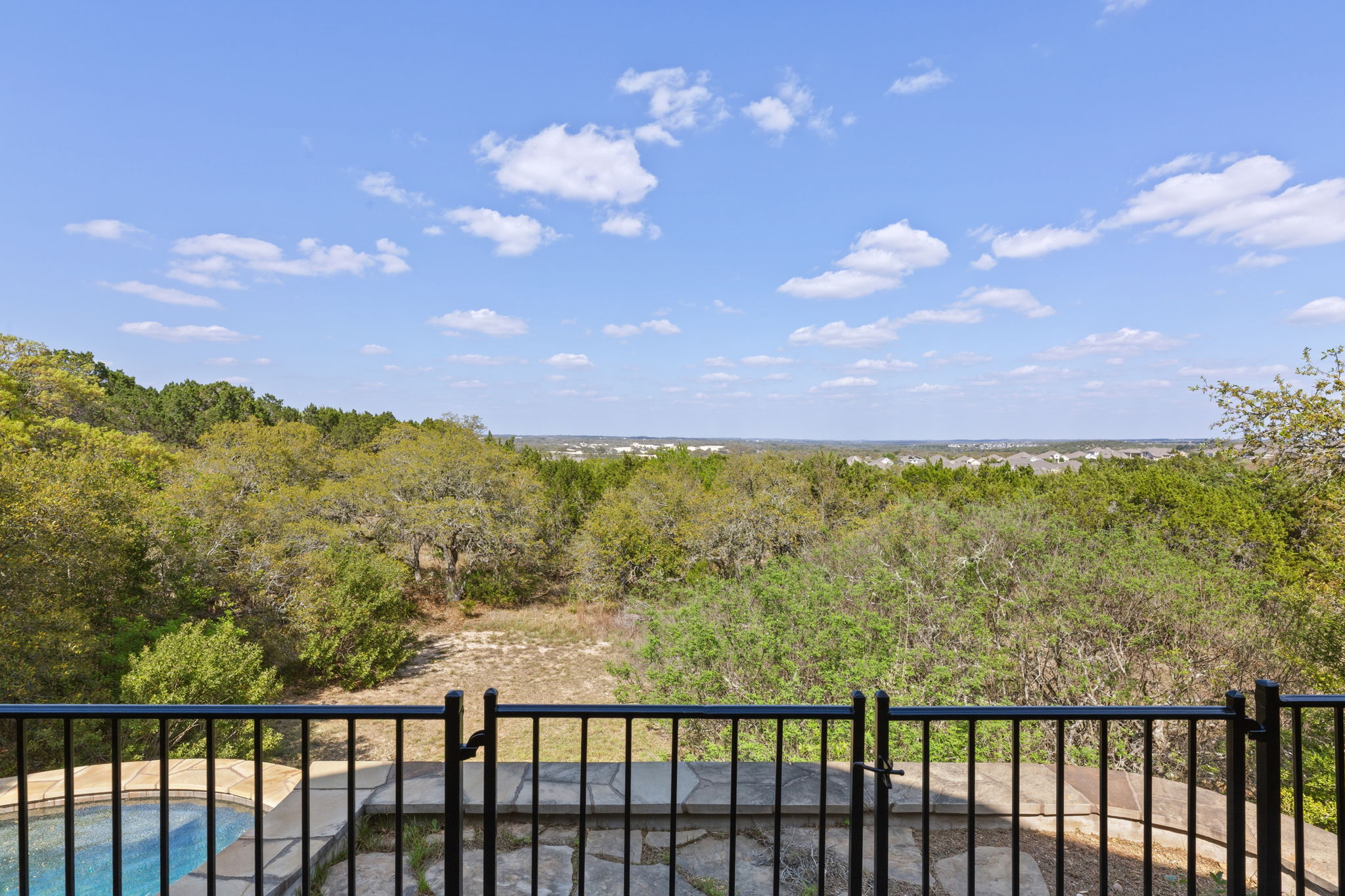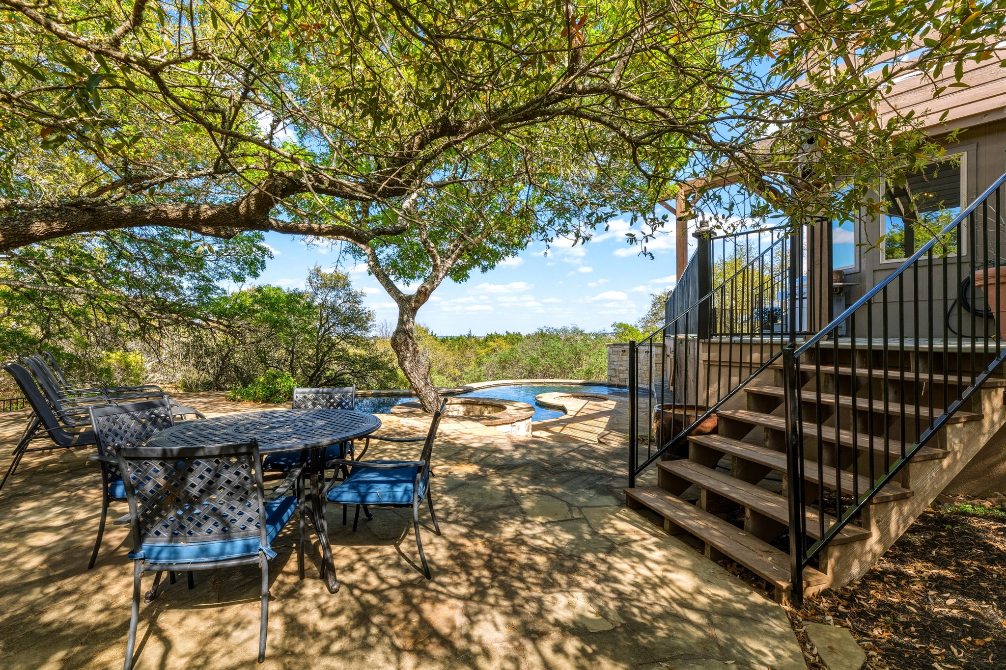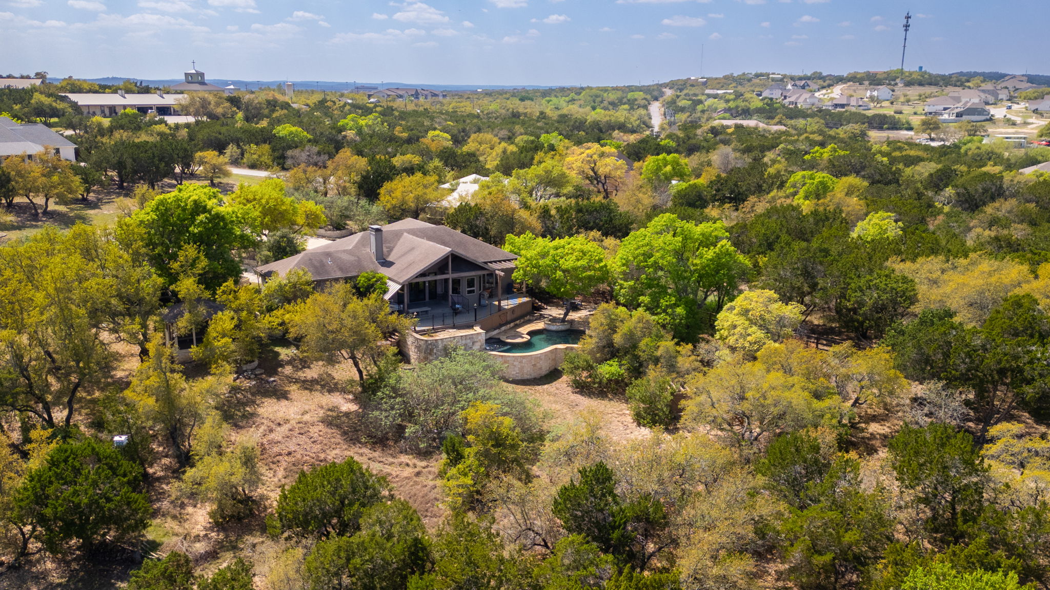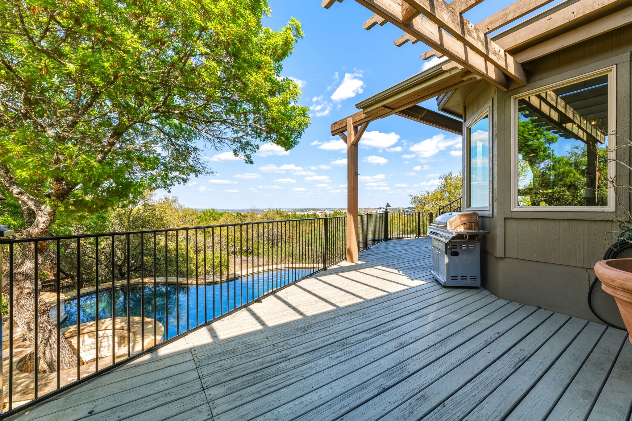 Fabulous outdoor pool and multi-tiered decks provide unobstructed vantage points for enjoying spectacular views of the surrounding hill country.