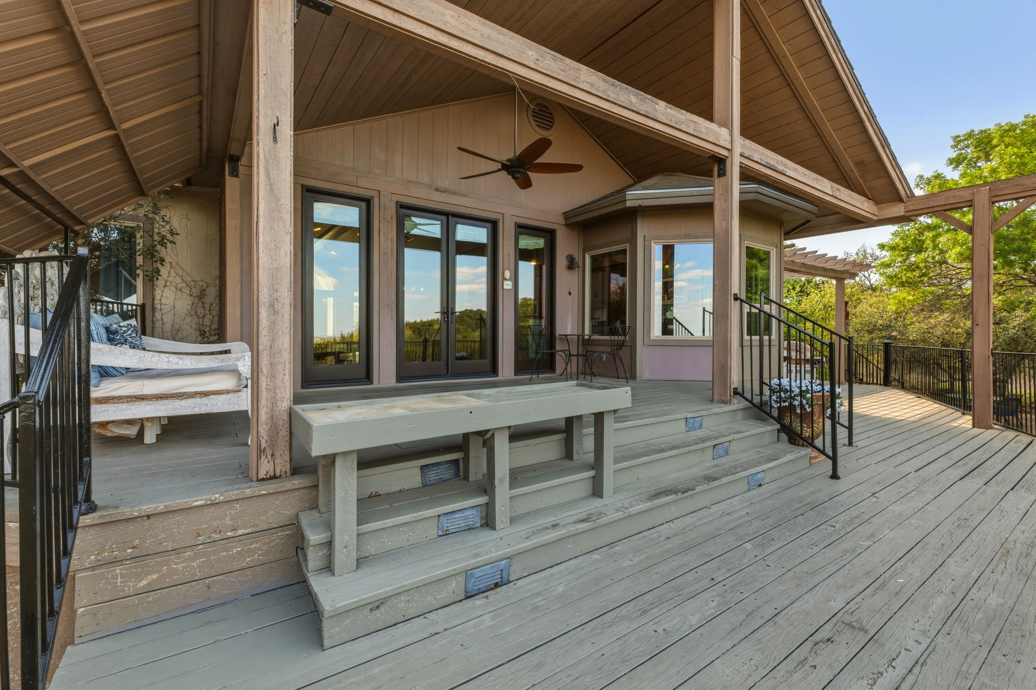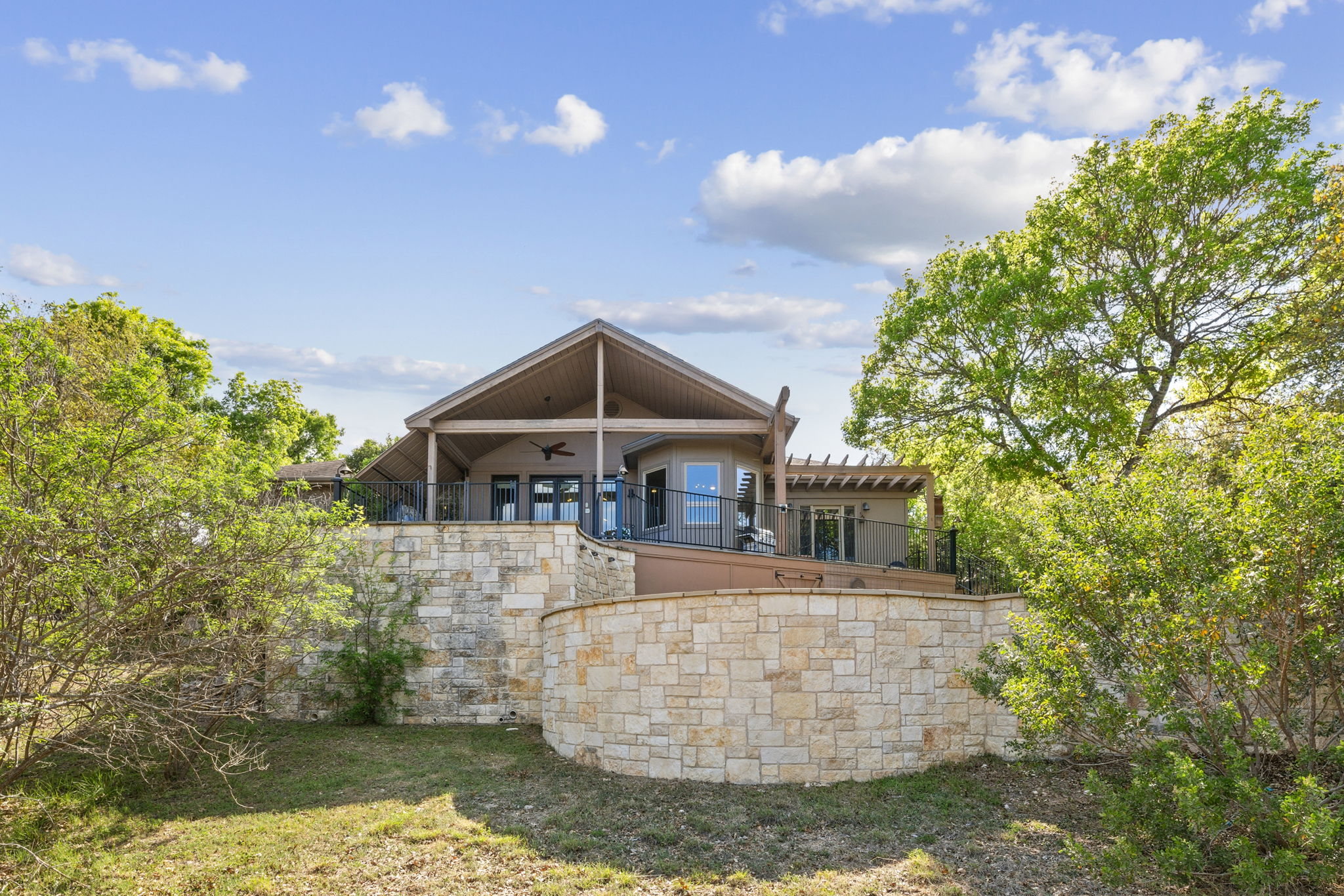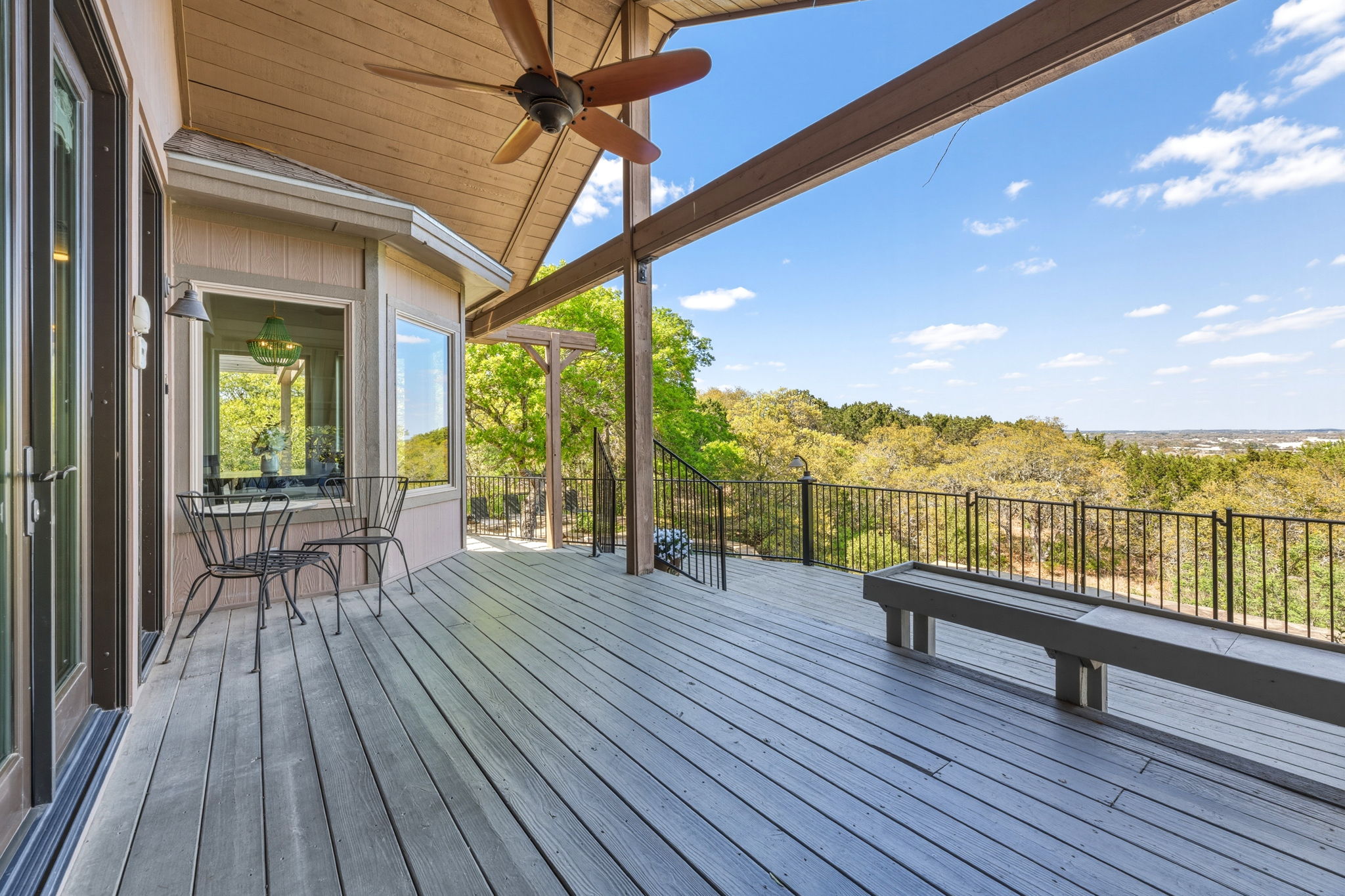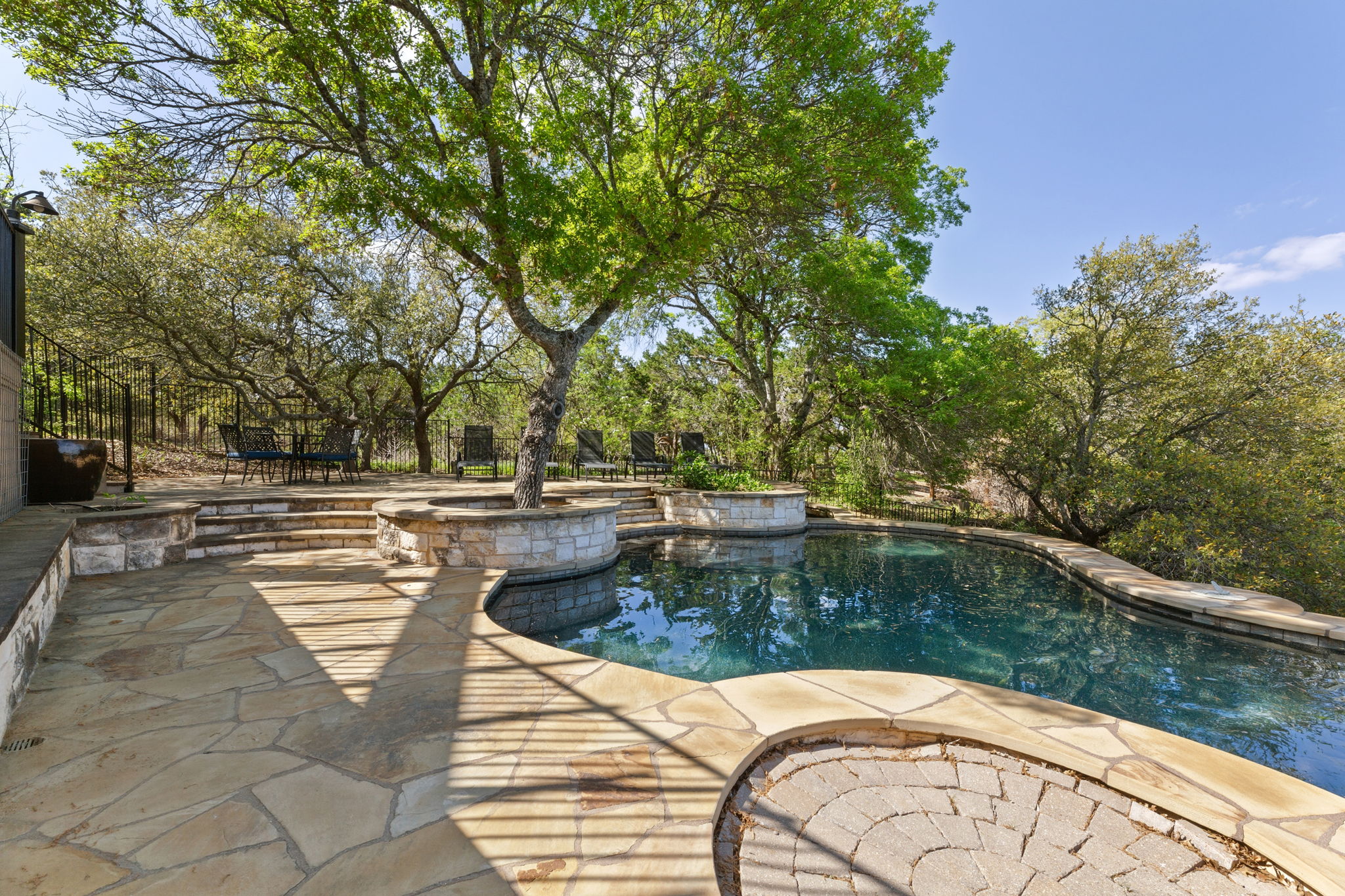 Fabulous outdoor pool and multi-tiered decks provide unobstructed vantage points for enjoying spectacular views of the surrounding hill country.
