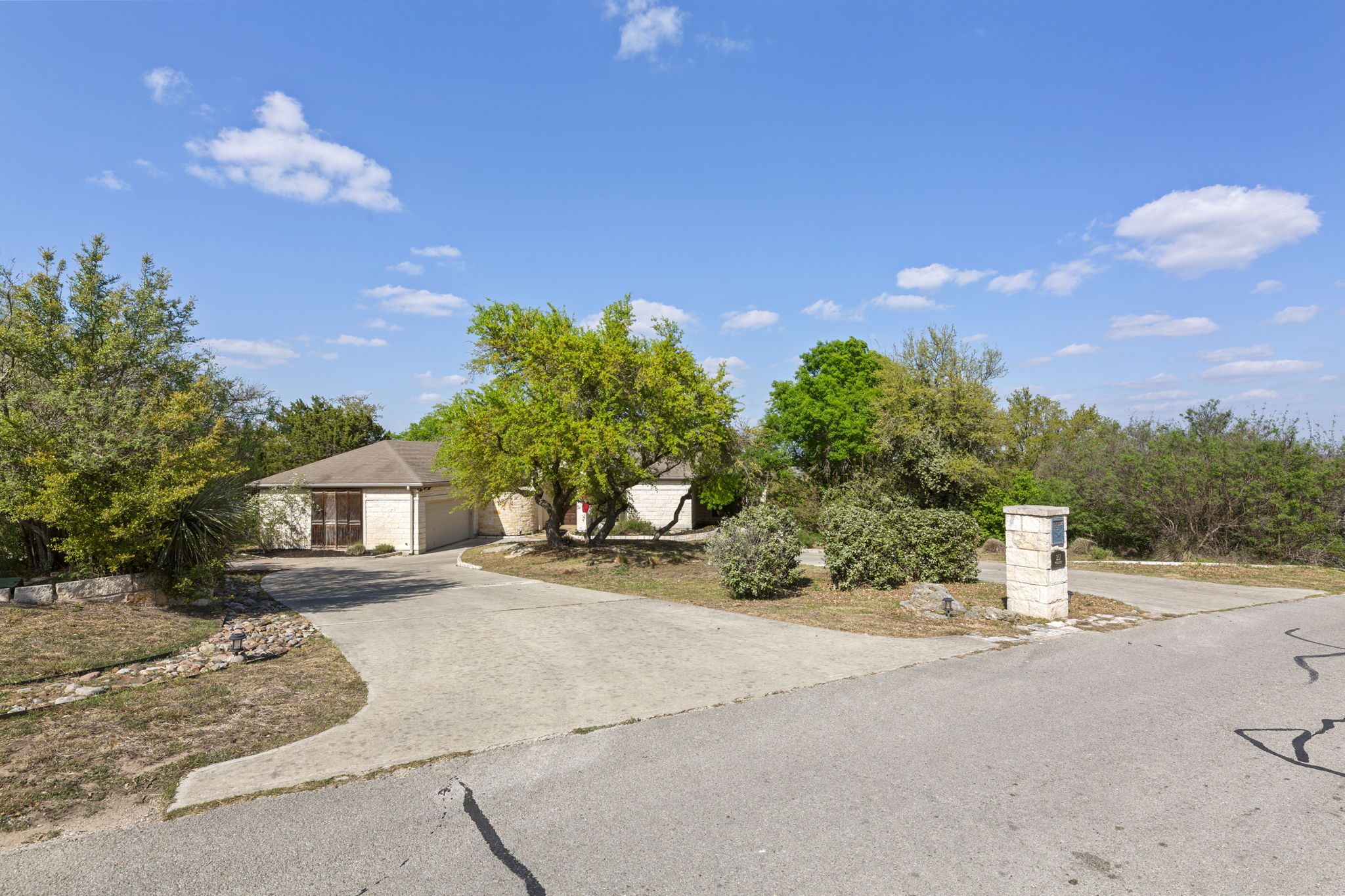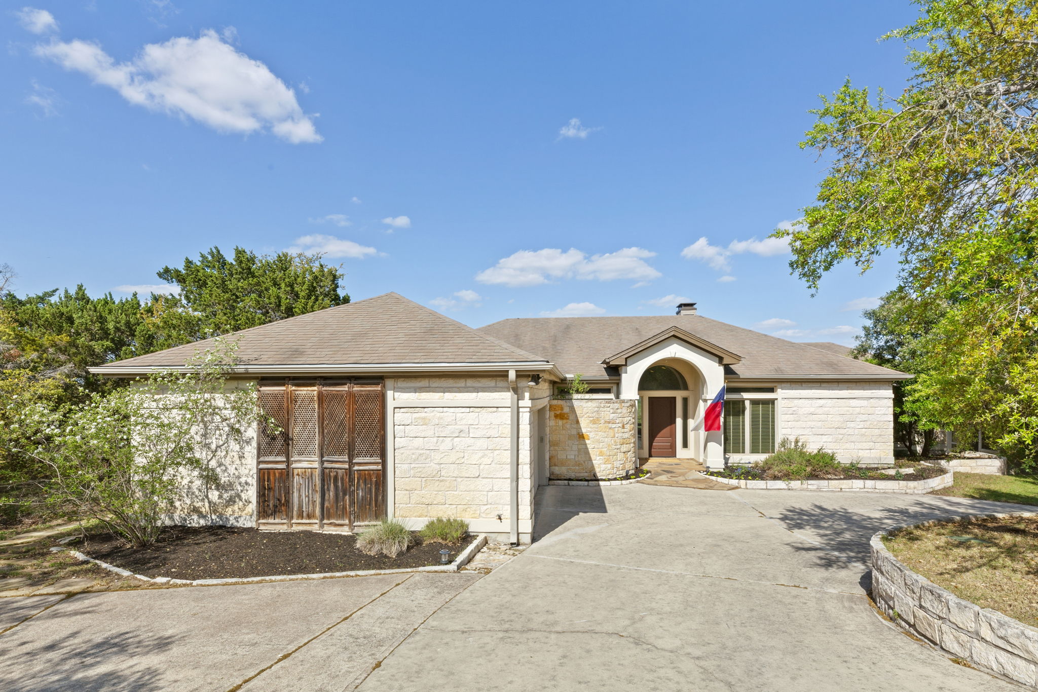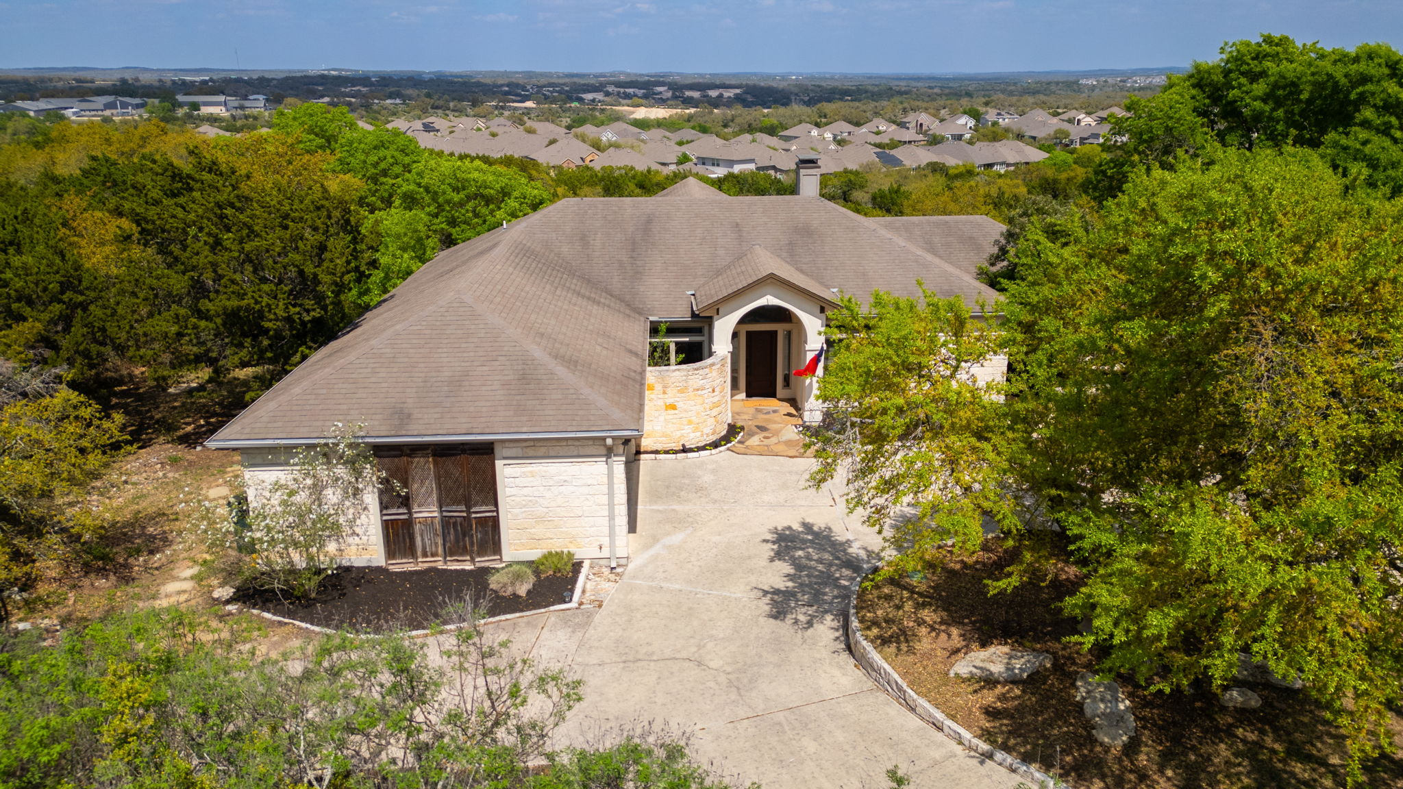 Lovely single-story home, perfectly situated on 1+ acres, overlooking the scenic Texas hill country. Elegant interior architecture includes high ceilings with recessed lighting, large columns, and archways.